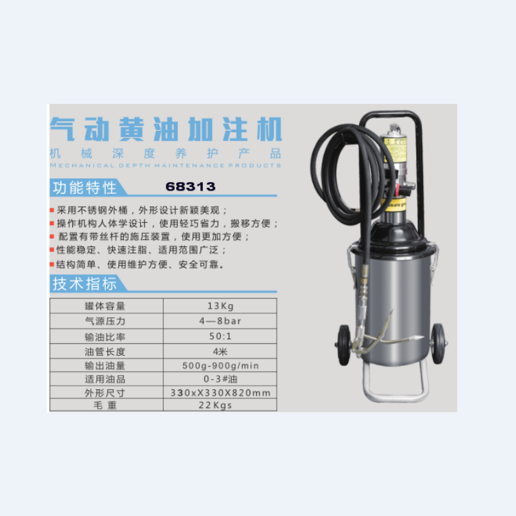 气动黄油机深圳巨川厂家介绍汽车专用12L黄油枪,适合个人家用,汽车修理店专用打黄油,使用简单,只需配备一个小型气动泵,移动方便,打黄油省时省力。黄油枪配置配套黄油机,黄油枪以及黄油管,安装简单,只需螺母拧上即可完成安装。