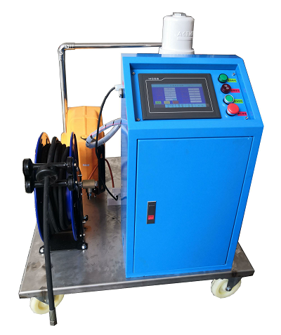 1) 气动黄油(油脂)定量加注机由泵、PLC、高压流量传感器、控制系统面板、移动小车、高压自动油管盘,自动收放电线盘,40L油桶等组成。
