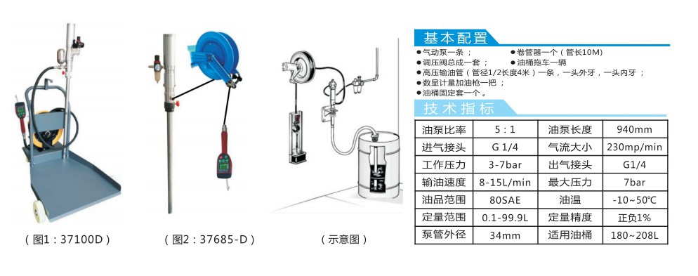 37100-D气动机油定量加注机产品简介 推车承重: 180—220Kg 预设定加油枪(37720) 吸油杆长:940mm 气源压力:4-8bar 定量范围:0.1-99.9L 定量精度:正负1% 软管盘:10m*1/2 气动抽油泵:5:1 Art.37100重型移动式稀油加注机配置高品质的气动柱塞泵,该油泵是一种新型液料抽吸装置,采用意大利先进技术、经电脑数控设备生产而成。 它以压缩空气作为动力源,通过柱塞往复运动带动吸头,抽吸各种黄油及稀油,进行罐装、加注、输送等作业。 售后服务及保修:供方提供一年的保修期