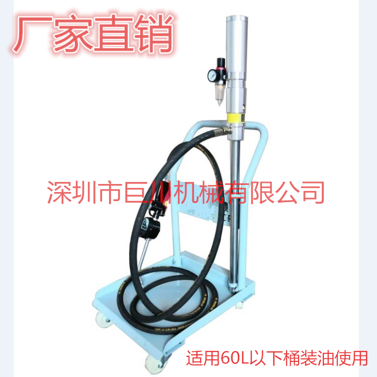 37152-S移动式气动润滑油加注器 【技术参数】 气源压力:4—8bar 输出油量:8-18L/min 推车承重:50Kg 双作用油泵:5:1 电子加油枪:37713 【产品简介】 使用动力:经净化之压缩空气 抽吸油料:各种机油及齿轮油 安装要求:垂直放置 输出压力:0.8-1.2Mpa 抽吸速度:8-18升/分钟 吸管直径:¢42毫米 软管规格:直径1/2英寸长4m,配备电子流量计及注油枪 先将油泵进油口插入油罐中,并用固定螺母将油泵固定在油罐上,然后在进气口处接上压缩空气,调整调压阀使气压表指针读数在0.6-0.8Mpa(出厂时已调好,一般无需调节),将出油口对准需要加油的位置,按下数显电子流量表上的清零按钮使显示读数为零,打开球阀使油泵开始工作,开启注油枪手柄即进行加油作业。观察电子流量表的读数,当达到所加油量时即可松开手柄,加油完毕,关闭球阀。 适用于汽车维修车间、换油服务中心、加油站,工程机械厂,车间生产线等 中高粘度发动机油,齿轮油,液压油,防冻液及其他类似流体的中,长距离的输送加注。 售后服务及保修:供方提供一年的保修期