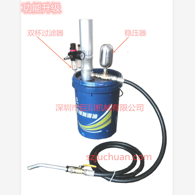 371520J气动液压油加注机 产品配置: 气动抽油泵:5:1 气源压力:4—8bar 计量单位:升 输出油管长度4米 先将油泵进油口插入油罐中,并用固定螺母将油泵固定在油罐上,然后在进气口处接上压缩空气,调整调压阀使气压表指针读数在0.6-0.8Mpa(出厂时已调好,一般无需调节),将出油口对准需要加油的位置,开启注油枪手柄即进行加油作业,到量关闭油枪,它以压缩空气作为动力源,通过柱塞往复运动带动吸头,抽吸各种黄油及稀油,进行罐装、加注、输送等作业 售后服务及保修: 供方提供一年的保修期