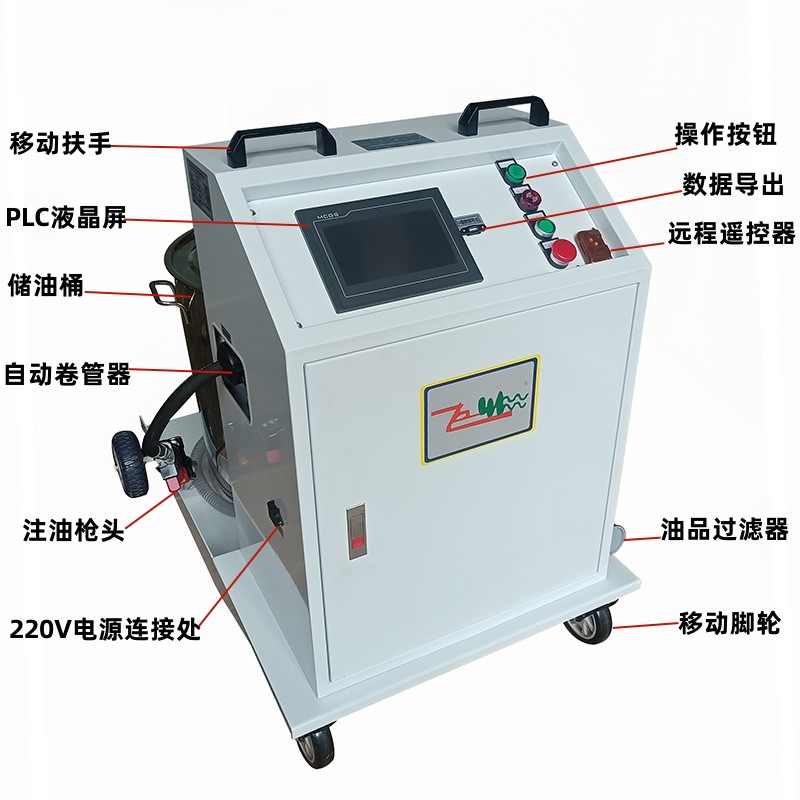 (1)主要技术参数: 移动式定量注油系统配置由供油输送系统,控制系统等构成,采用PLC液晶操作显示屏,高精度流量计等装置对油品进行定量加注、输送等作业。 适用于机械生产车间原装油或其他类似流体油料的定量加注作业。是目前汽车厂,铁路工程、汽车4S站,快速换油服务中心,车间生产线等优选加注设备。 技术参数: (2)特 点: 电动输送油泵: 220V,50HZ 功率:1.5KW 重型移动推车:承重180-220KG标准油桶使用 定量控制界面:PLC液晶触摸操作显示屏,操作简单、方便 设定范围:1-9999.9L (随意设定定量值) 时间间隔范围:1-999S 注油精度:±1%; 供油枪数量: 1把 自动卷管器:10米; 批量加注次数设定范围:1-999次; 抽吸油料:齿轮油,机油,液压油,润滑油,含过滤装置; 控制界面: 液晶触摸操作显示屏,PLC定量控制操作简单方便 界面设定有:定量加注,非定量加注,系统设置,数据查询等功能 数字预设、修改、存储,导出,网络连接等功能配置; 采用重复性能稳定高精度流量计传感器,控制定量加注; 硬件选择可靠、稳定,性价比高,操作简便、界面友好; 开关阀感应敏捷、耐压高、可靠性高,操作简单; 数字预设、修改、存储加注量;加注数值实时动态,数字液晶显示单次及累计加注量;操作员工号输入保存,密码开锁,异常报警装置 可根据批量加注要求,设定自动重复加注的间隔时间,是生产线大批量定量加注提高工作效率的优选配置。
