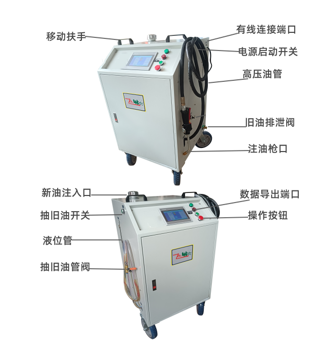 单次及累计加注量;操作员工号输入保存,油品型号输入保存,注油异常报警装置 加注精度可进行校准标定,确保了加注精度; 数字预设、修改、存储已加注量;加注数值实时动态显示 数据可按帐号进入系统:手机或PC登入下载APP,设备必需有网络方可使用(以态网或4G卡) 数据传输:设备需连接有线网络、以态网或 4G 卡其中一项实现,在可进入网页的手机或电脑登入APP,输入帐号 密码查询 操作步骤:开启电源——刷卡解锁——进入系统设置---预设定加注量——工件到位――对准加油口――加油信号(人工给定)――到量自动停止 |