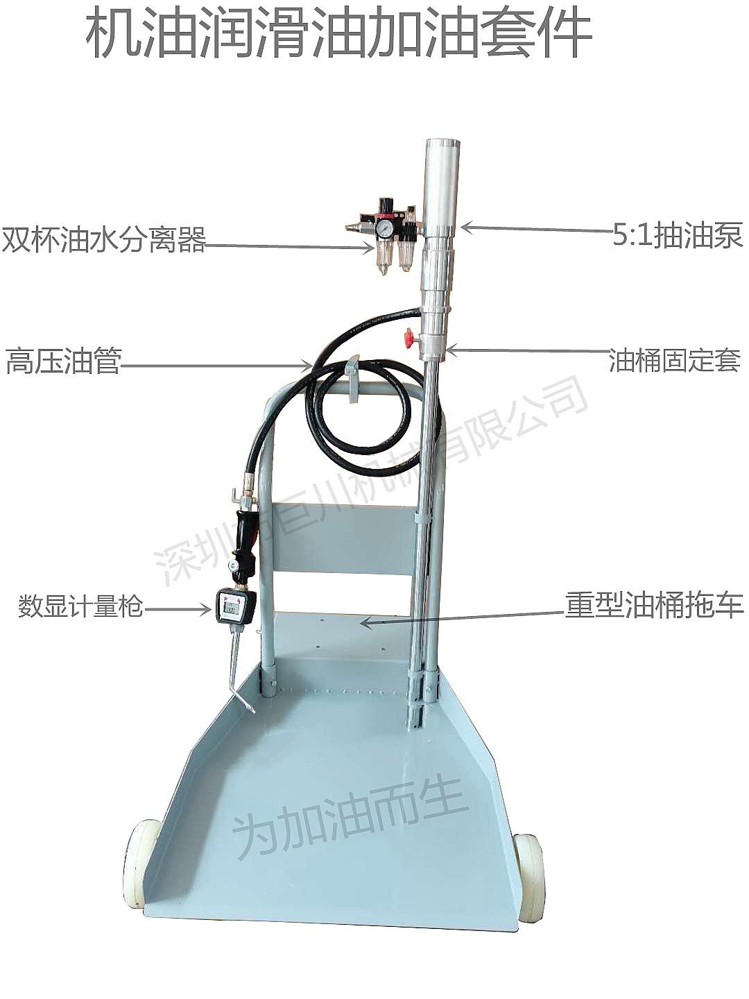 | 【技术参数】 吸油杆长:940mm 气源压力:4—8bar 输出油量:8-18L/min 推车承重:180—220Kg 气动抽油泵:5:1 电子加油枪:37713 【产品简介】 使用动力:经净化之压缩空气 抽吸油料:各种机油及齿轮油 安装要求:垂直放置 输出压力:0.8-1.2Mpa 吸管直径:¢42毫米 软管规格:直径1/2英寸长4m,配备电子流量计及注油枪 先将油泵进油口插入油罐中,并用固定螺母将油泵固定在油罐上,然后在进气口处接上压缩空气,调整调压阀使气压表指针读数在0.6-0.8Mpa(出厂时已调好,一般无需调节),将出油口对准需要加油的位置,按下数显电子流量表上的清零按钮使显示读数为零,打开球阀使油泵开始工作,开启注油手柄即进行加油作业。观察电子流量表的读数,当达到所加油量时即可松开手柄,加油完毕,关闭球阀。 适用于汽车维修车间、换油服务中心、加油站,工程机械厂,车间生产线等 中低粘度发动机油,齿轮油,液压油,防冻液及其他类似流体的中,长距离的输送加注。  , |