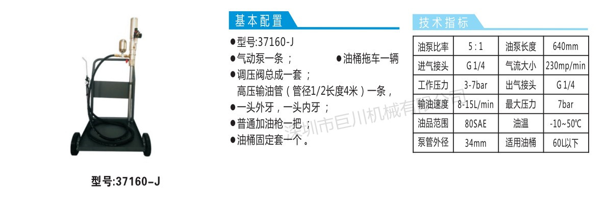 37160-J气动稀油加注机 产品配置: 气动抽油泵:5:1 气源压力:4—8bar 计量单位:升 移动式推车一台(选配件) 输出油管长度4米 适用于60L以下油桶使用 先将油泵进油口插入油罐中,并用固定螺母将油泵固定在油罐上,然后在进气口处接上压缩空气,调整调压阀使气压表指针读数在0.4-0.8Mpa(出厂时已调好,一般无需调节),将出油口对准需要加油的位置,开启注油枪手柄即进行加油作业,到量关闭油枪,它以压缩空气作为动力源,通过柱塞往复运动带动吸头,抽吸各种黄油及稀油,进行罐装、加注、输送等作业 售后服务及保修: 供方提供一年的保修期