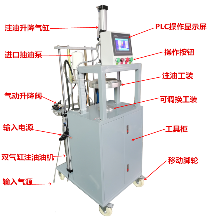 移动式气动双立柱定量加注机(电气组合),双气缸设置专用压油升降机带工装(按要求定制)加注设备,实时计量准,重复性好,液晶显示人机操作界面。