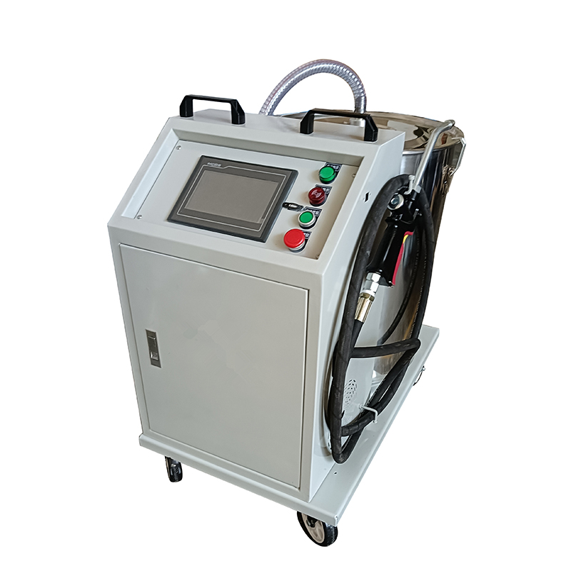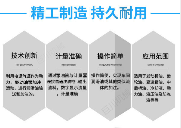 (1)特点:采用单片机液晶操作显示屏,高精度流量计装置对油品进行罐装、加注、输送等作业。在实现了数字预设、修改、同时还能实现自动循环工作和信号输出。 适用于机械生产车间原装油或其他类似流体油料的高频率定量加注作业。是目前汽车修理厂,铁路工程、汽车4S站,快速换油服务中心,车间生产线等领域首选加注设备。 参 数: 电动抽油泵:220V,50HZ 功率:1.5KW 油桶容量:100L 压力范围:1-3Mpa 油料温度:0-40℃ 定量控制界面:JC900 设定范围:1-9999.9L 时间间隔范围:1-999S 注油精度:±1%; 供油枪数量: 1把(简易加油枪) 移动推车:1个 软管规格:输出油管长2米. 吸油管及金属管配套; 采用重复性能稳定高精度定量检测的流量计控制定量加注; 硬件选择可靠、稳定,性价比高,操作简便、界面友好; 开关阀感应敏捷、耐压高、耐用、可靠性高; 数字预设、修改、校正,异常报警装置 加注精度可进行标定,确保加注精度,工作状态实时动态显示,数字液晶显示单次及累计加注量; 加注精度可进行校准标定,确保了加注精度; 可根据批量加注要求,设定自动重复加注的间隔时间,是生产线大批量定量加注提高工作效率的首选配置。 加注步骤:预设定好加油量-工件到位―注油口固定―加油信号(人工给定)―计量加注―自动停止 适用于发动机油、齿轮油、变速箱油、中后桥油、冷却液、动力油、液压油及防冻液或其他类似不含腐蚀性流体的在非真空状态下长距离的定量输送加注