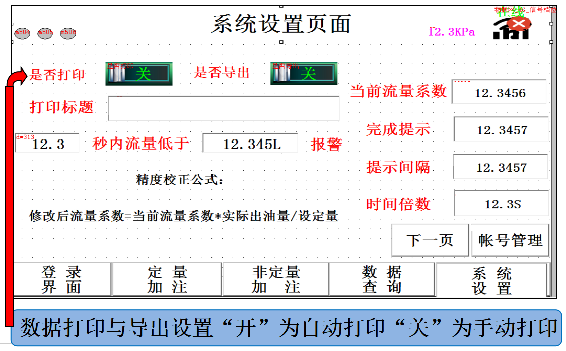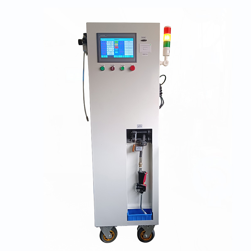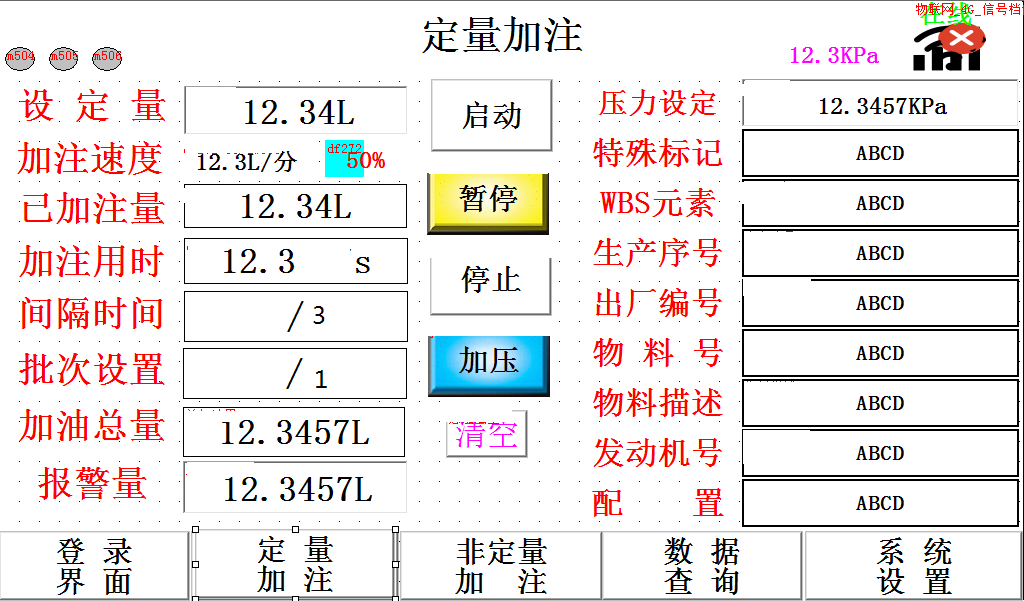 防冻液定量加注系统配置由定量注油系统,抽真空加注系统等构成,采用电气组合,PLC液晶操作显示屏,高精度流量计等装置对油品进行定量加注、输送等作业。适用于机械生产车间原装油或其他类似流体油料的定量加注作业。 技术参数: 220V电动溶济泵:1个 功率:550W 使用气源: 0-7 bar 界面压力预设:7bar 自动卷管器:长度10米 PLC定量控制界面:10寸液晶屏 设定范围:1-9999.9ML 注油精度:±1%; 普通加油枪:1个 智能遥控器:配套 接油盒: 配套 扫码枪:配套 抽吸油料:防冻液,抽真空加液转换装置; 控制界面: 液晶触摸操作显示屏,PLC定量控制操作简单方便 界面设定有:定量、非定量加注,系统设置,数据查询,导出,打印等功能; 采用重复性能稳定高精度流量计传感器,控制定量加注; 硬件选择可靠、稳定,性价比高,操作简便、界面友好; 开关阀感应敏捷、可靠性高,操作简单; 数字预设、修改、存储,导出,打印,扫描,压力预设,抽真空,网络连接等功能配置; 加注数值实时动态,数字液晶显示单次及累计加注量;数据输入保存,密码开锁,异常声光报警装置 抽取真空时旋转左侧开关,横向为送,竖向为开,对接好启动开关抽取至-0.6或-0.7时停止 可根据加注量要求设定启动加注,是生产定量加注提高工作效率的优选配置。 远距请选用智能遥控器,A为启动,B为停止