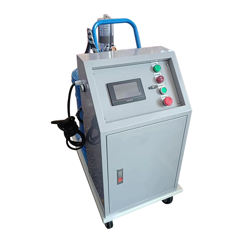 JC800-40移动式气动数显定量注脂机 【简述:】 移动式电动数显定量注脂机JC800-40压力高,实时计量准,重复性好,液晶显示人机操作界面,广泛用于换油中心,车间生产线、冶金,造纸,电子,电力,港口、工程机械、汽车、机械设备、轮船农用车辆等场合润滑油脂的精确定量润滑输送和加注。 【技术参数:】 气动泵:45:1/50:1 吐出油量:500-800g/Min; 气源压力: 4-8Kg/cm2 定量控制器:TI800 功率:100W 电源:220V 输油管:1/4,2米 适用油类 0~3号黄油 ; 工作环境温度:-10ºC-50ºC 流量计:高精度椭圆齿轮流量计 定量控制油品种类:1种 设定范围:1-9999.9G 时间间隔范围:1-999S 注油精度:优于±1%; 适用0#~3#黃油均能順畅注入