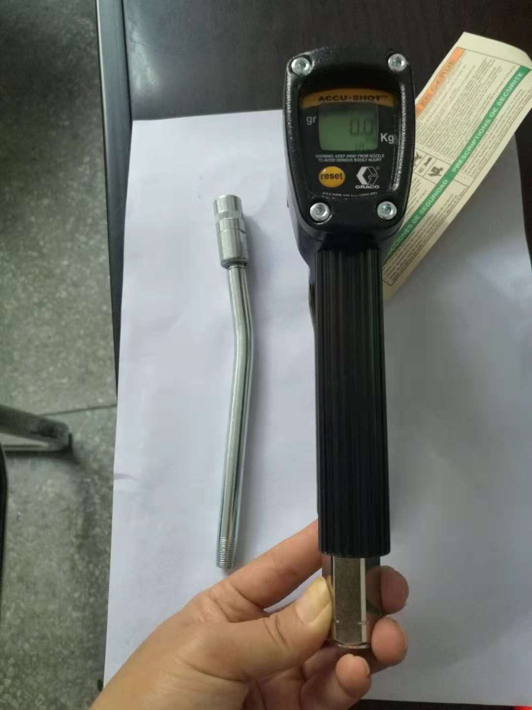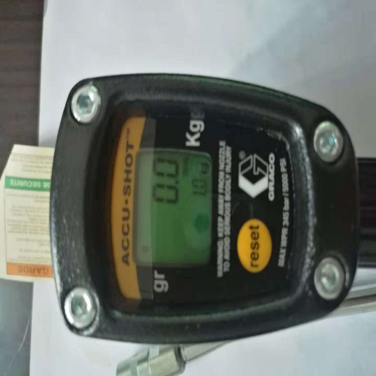 电子润滑脂计量加注枪(固瑞克品牌) 【技术参数】 尺寸:8.72inL×4.43inH×1.83inW 重量:2.2ibs(1kg) 入口:1/4in NPTF 出口:1/8in NPTF 最大工作压力:5000pai 工作温度(最大):60℃ 流量:可达35.3 oz/min(1000 g/min) 注油精度:±3% 电池:2×1.5AA碱性电池(标准碱性电池) 【特 点】 计量、控制润滑脂输送 椭圆齿轮计量技术 先进的电子控制 铝制结构、自重轻、光滑美观 读数、操作简便 可复位电子液晶显示器 每分钟流量36盎司(1000 g) 工作压力达到5000psi(345bar,34.5MPa) 输送精度±3% 【益 处】 计量润滑脂加注 润滑高效、精确 记录各润滑点润滑脂用量无需估计 降低操作疲劳 进行防护保养的优秀工具 售后服务及保修:供方提供一年的保修期